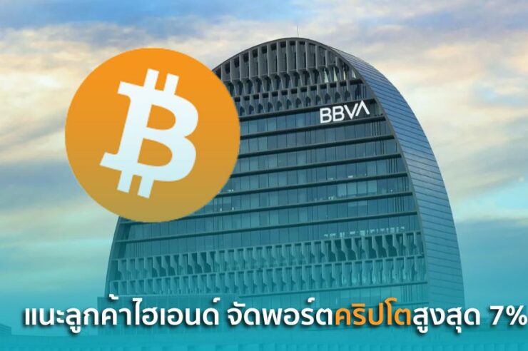ธนาคาร BBVA (Banco Bilbao Vizcaya Argentaria) ซึ่งเป็นธนาคารที่ใหญ่เป็นอันดับ 2 ของสเปน กำลังแนะนำให้ลูกค้าที่มีสินทรัพย์สูง จัดสรรพอร์ตการลงทุนในคริปโตระหว่าง 3% ถึง 7% ตามระดับความเสี่ยงที่ยอมรับได้ของแต่ละบุคคล