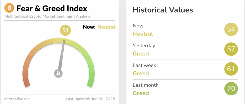นอกจากนี้ แม้ราคา Bitcoin จะปรับตัวพุ่งขึ้นอย่างรวดเร็วในช่วงไม่กี่วันที่ผ่านมา แต่ดัชนีความกลัวและความโลภ (Fear & Greed Index) ยังคงเคลื่อนไหวอยู่ในระดับกลางที่ 54 คะแนน ซึ่งบ่งชี้ว่านักลงทุนส่วนใหญ่ยังคงมีท่าที ระมัดระวัง โดยเฉพาะในช่วงที่สถานการณ์ความขัดแย้งระดับโลกยังคงตึงเครียด และมีแนวโน้มจะทวีความรุนแรงมากขึ้นเรื่อย ๆ