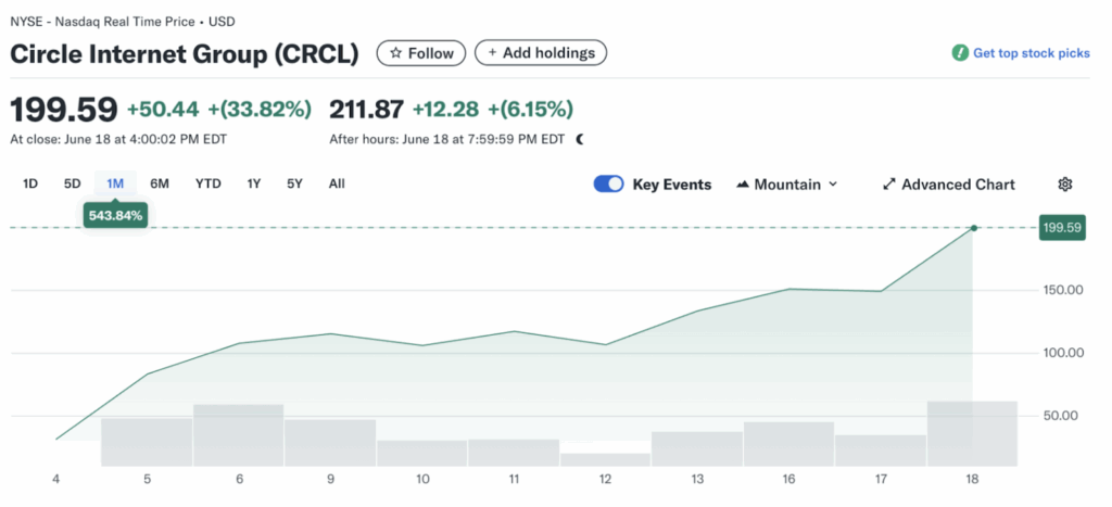 เมื่อวันที่ 18 มิ.ย.ที่ผ่านมา ราคาหุ้น Circle (CRCL) ปิดตลาดที่ 199.59 ดอลลาร์ ซึ่งพุ่งขึ้นถึง 33.8% จากราคาเปิดตลาดที่ 153.22 ดอลลาร์ แถมยังทำสถิติปริมาณการซื้อขายสูงสุดถึง 63.5 ล้านหุ้น และยังเดินหน้าบวกต่อเนื่องอีก 6% ในช่วงนอกเวลาซื้อขาย