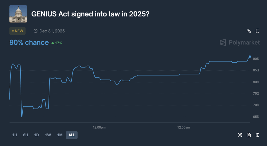 ล่าสุดในวันนี้ โอกาสที่ร่างกฎหมาย GENIUS Act จะผ่านสภาผู้แทนราษฎร และได้รับการลงนามเป็นกฎหมายโดยประธานาธิบดีก่อนปี 2026 เพิ่มขึ้นสูงถึง 90%