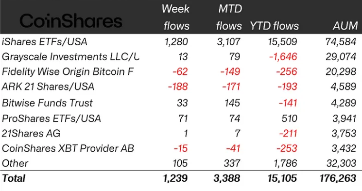 ทางด้านกองทุน BlackRock ยังคงเป็นผู้นำด้วย iShares Bitcoin ETF ที่นำเงินไหลเข้า 1.3 พันล้านดอลลาร์ ขณะที่ ProShares และ Bitwise รับเล็กน้อย 77 ล้านดอลลาร์และ 33 ล้านดอลลาร์ ด้าน ARK Invest และ Fidelity เจอไหลออก 188 ล้านดอลลาร์กับ 62 ล้านดอลลาร์ตามลำดับ