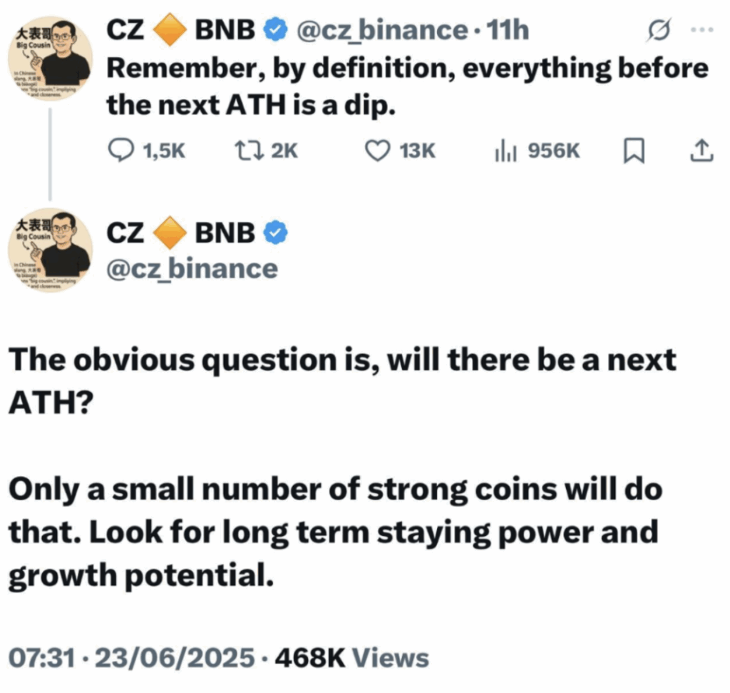 เมื่อวันที่ 22 มิถุนายนที่ผ่านมา CZ ได้โพสต์ข้อความบนโซเชียลมีเดีย X โดยเขากระตุ้นให้นักลงทุนมองระดับราคาปัจจุบันด้วยมุมมองระยะยาว เพราะ “หากพูดกันตามหลักการแล้ว ทุกอย่างที่เกิดขึ้นก่อนหน้าที่ราคาจะไปถึงจุดสูงสุด (ATH) ครั้งใหม่ ก็เป็นเพียงแค่การปรับฐาน (Dip) เท่านั้น”
