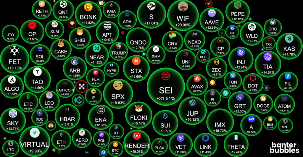 ตามข้อมูลจาก Banterbubbles ล่าสุดแสดงให้เห็นว่าเหรียญ Altcoins ส่วนใหญ่ปรับตัวขึ้นอย่างชัดเจน โดยเหรียญ SEI กลายเป็นผู้นำตลาดด้วยการปรับตัวขึ้นแรงถึง +31.51% ตามมาด้วย SPX ที่บวก +18.83% และ FET +18.13%