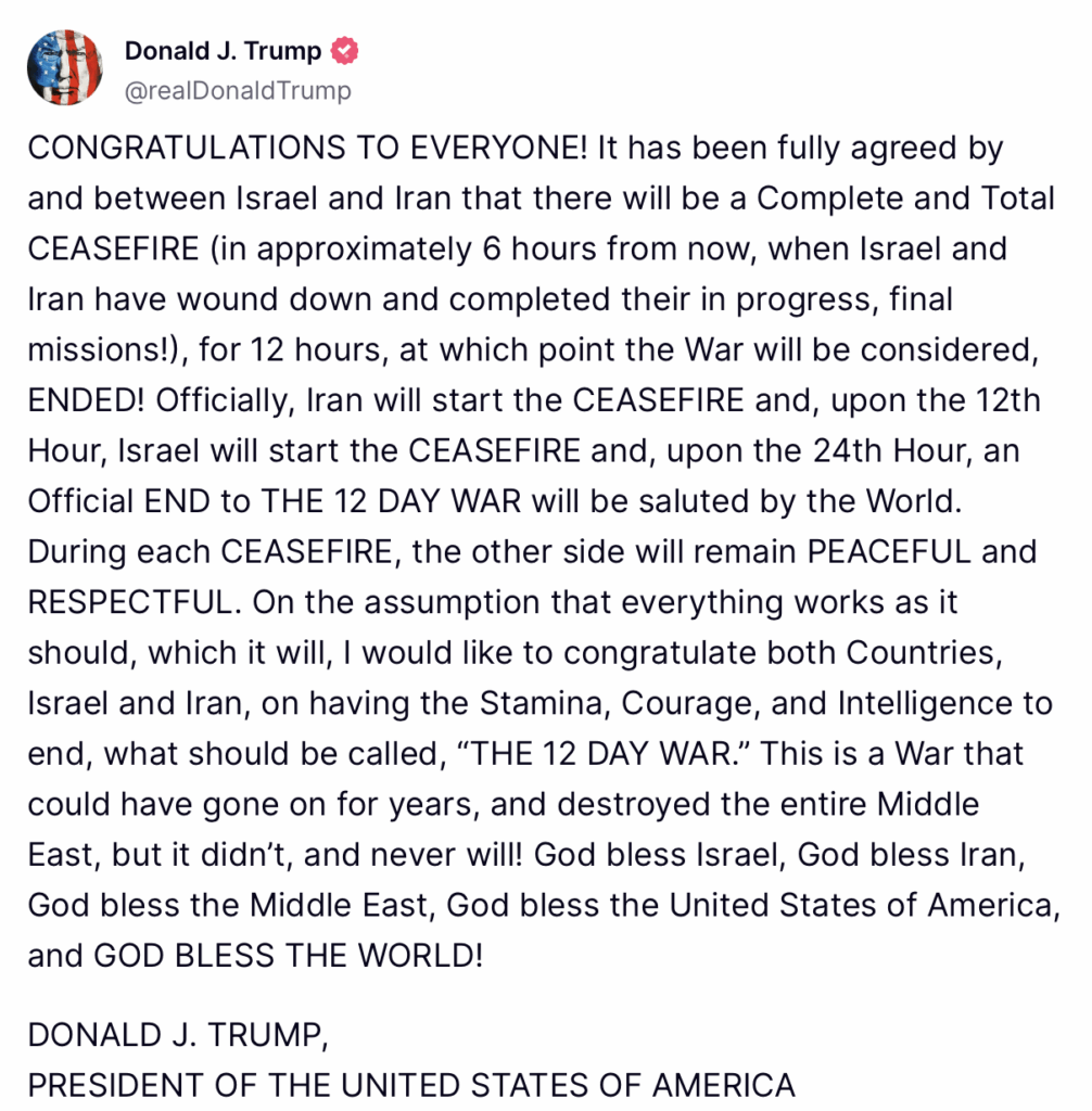 อย่างไรก็ตาม สถานการณ์ได้เปลี่ยนแปลงอย่างฉับพลัน เมื่อประธานาธิบดีทรัมป์ได้ออกมาโพสต์ข้อความบน Truth Social โดยยืนยันว่า ทั้งสองฝ่ายบรรลุข้อตกลงหยุดยิงอย่างเป็นทางการ พร้อมระบุว่าเป็น “ช่วงเวลาแห่งสันติภาพที่โลกเฝ้ารอ”
