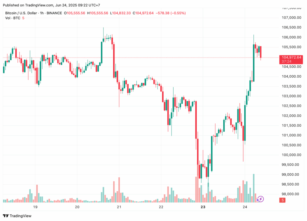ราคา Bitcoin พุ่งทะยานทะลุ $106,000 เมื่อเวลาประมาณ 04.00 น. ของรุ่งเช้าวันนี้ (24 มิถุนายน) หลังประธานาธิบดีโดนัลด์ ทรัมป์ ประกาศผ่านโซเชียลมีเดียว่า สหรัฐฯ บรรลุ “ข้อตกลงหยุดยิงอย่างสมบูรณ์และเด็ดขาด” ระหว่างอิสราเอลและอิหร่าน ซึ่งคาดว่าจะเริ่มมีผลภายใน 6 ชั่วโมงหลังจากนี้