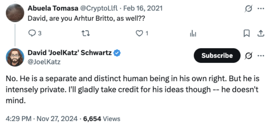 ด้าน David Schwartz ผู้ร่วมก่อตั้ง Ripple อีกราย ได้รีบออกมายืนยันผ่าน X ทันทีว่าโพสต์บนบัญชีของ Britto นั้น “ไม่ใช่การถูกแฮ็ก” เป็นการโพสต์จากเจ้าตัวจริงๆ ทำให้ความสนใจในตัว Britto พุ่งสูงขึ้นไปอีก พร้อมระบุว่า Britto เป็น “มนุษย์ที่มีตัวตนอยู่จริง”
