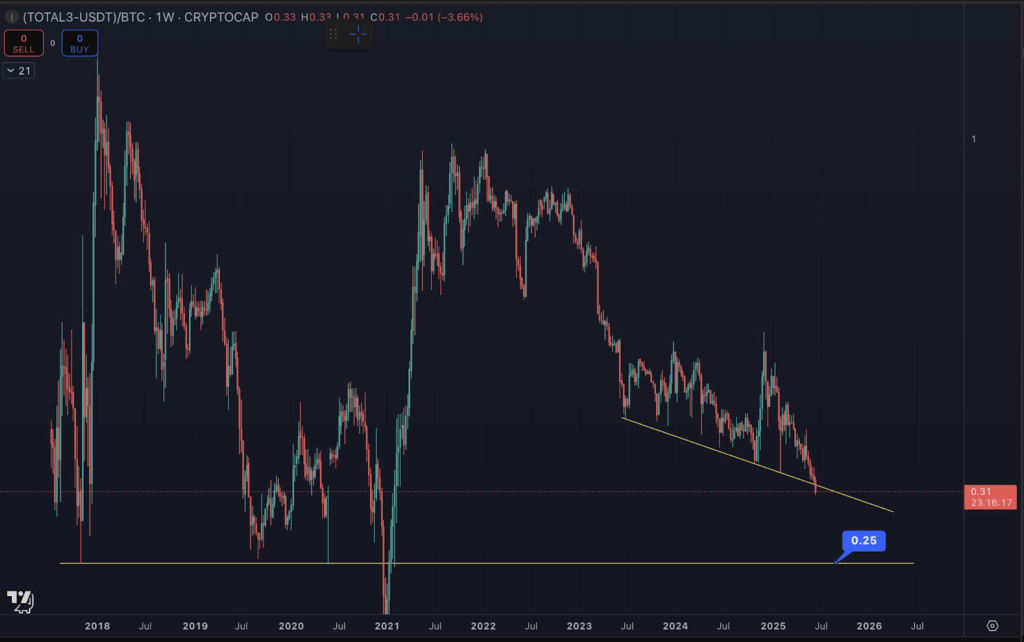 อย่างไรก็ตาม ทางฝั่งของ altcoins นั้นน่าเป็นกังวลยิ่งกว่า โดย Cowen ย้ำชัดว่า การที่ Bitcoin ปรับฐานลงมาจะเป็นตัวกระตุ้นทำให้ฝั่งของ altcoins เกิดการนองเลือด ทำราคาดิ่งลงอย่างรุนแรงโดยเฉพาะอย่างยิ่งในคู่เทรด ALT/BTC ซึ่งกราฟก็ชี้ให้เห็นแล้วว่ามูลค่าของ altcoins ร่วงเร็วกว่า Bitcoin มาก