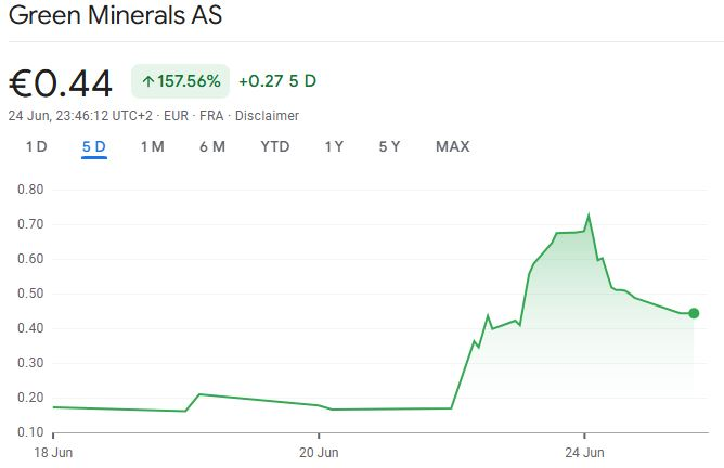 หลังประกาศข่าวการถือ Bitcoin หุ้นของ Green Minerals พุ่งขึ้นกว่า 300% ในวันจันทร์ ปิดตลาดที่ 0.68 ยูโรต่อหุ้น (ราว 0.79 ดอลลาร์) อย่างไรก็ตาม ราคาหุ้นได้ปรับตัวลงแรงในวันถัดมา โดยลดลงกว่า 34% มาปิดที่ 0.44 ยูโรต่อหุ้น ตามข้อมูลจาก Google Finance
