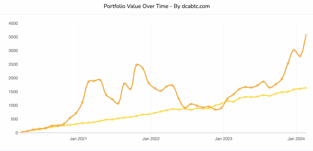 ตัวอย่างอัตราตอบแทนจากการออม Bitcoin ในระยะยาวด้วยเงิน 1,000/ต่อเดือน ด้วยเงื่อนไขการเข้าซื้อทุกวันที่ 1