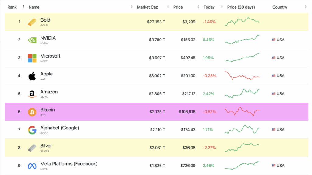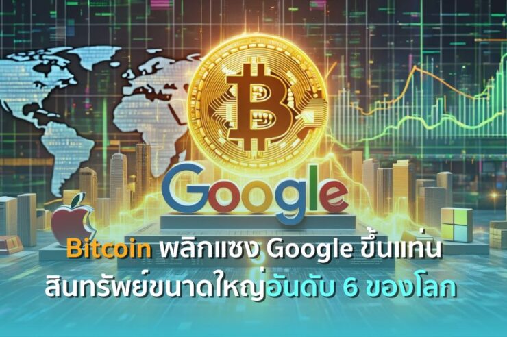 ล่าสุด Bitcoin เพิ่งสร้างปรากฏการณ์ครั้งใหญ่ด้วยการมีมูลค่าตลาดรวมพุ่งทะลุ 2.128 ล้านล้านดอลลาร์สหรัฐฯ แซงหน้ายักษ์ใหญ่อย่าง Google (Alphabet) ที่มีมูลค่า 2.075 ล้านล้านดอลลาร์สหรัฐฯ ไปได้อย่างฉิวเฉียด ทำให้ Bitcoin ก้าวขึ้นมาเป็น สินทรัพย์ที่มีมูลค่ามากที่สุดเป็นอันดับ 6 ของโลก โดยเป็นรองแค่ทองคำ, Nvidia, Microsoft, Apple และ Amazon เท่านั้น
