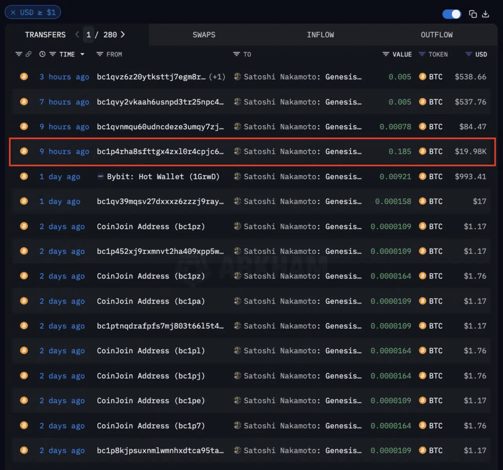 ที่อยู่ของ Satoshi Nakamoto ได้รับ BTC จำนวน 20,000 ดอลลาร์จากกระเป๋าเงินที่ไม่ระบุชื่อ 1 กรกฎาคม 2025 | ที่มา: Arkham
