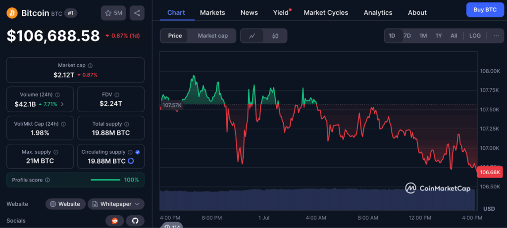 ในขณะที่รายงาน ราคา Bitcoin กำลังซื้อขายอยู่ที่ 106,688 ดอลลาร์ ลดลง 0.87% ภายใน 24 ชั่วโมง อ้างอิงข้อมูลจาก coinmarketcap
