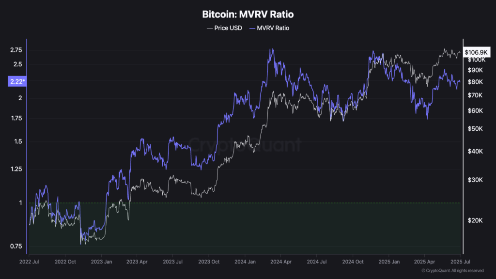 สุดท้ายนี้ MVRV ซึ่งเป็นตัวชี้วัดสำคัญอีกตัว เพราะ MVRV จะเป็นตัวบอกว่า BTC ตอนนี้ “แพงหรือถูก” เทียบกับราคาต้นทุนเฉลี่ยของตลาด สำหรับวิธีการอ่านค่าดังกล่าวให้นักเทรดดูอัตราส่วนฝั่งซ้ายมือ ถ้าหากตัวเลขต่ำกว่า 1.0 แปลว่าคนส่วนใหญ่ขาดทุน และมักเป็นช่วงที่น่าสนใจสำหรับการสะสม BTC ระยะยาว แต่ถ้าหากตัวเลขสูงเกิน 3.0 แปลว่าคนส่วนใหญ่อยู่ในจุดกำไร และอาจเริ่มขายได้ทุกเมื่อ