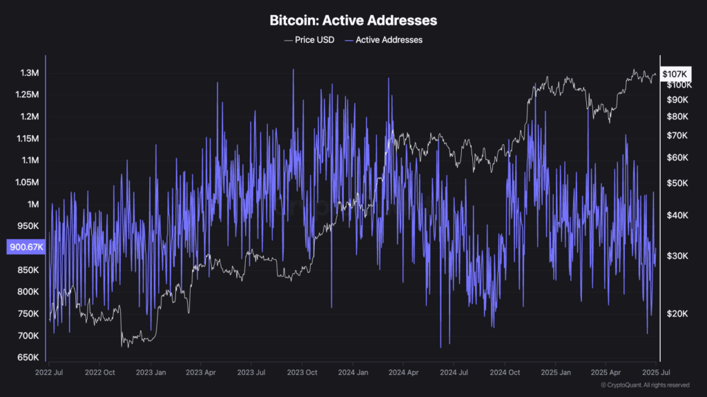 Active Addresses จะเป็นการเปรียบเทียบระหว่างราคาและกระเป๋า โดยที่เส้นสีขาวจะเป็นราคา และเส้นสีน้ำเงินม่วงจะเป็นจำนวนกระเป๋า โดยข้อมูลจากกราฟแสดงให้เราเห็นว่าแม้ราคาจะสูงถึง $107,000 แต่ปัจจุบันตลาดกลับไม่ได้คึกคักเท่าไหร่นัก