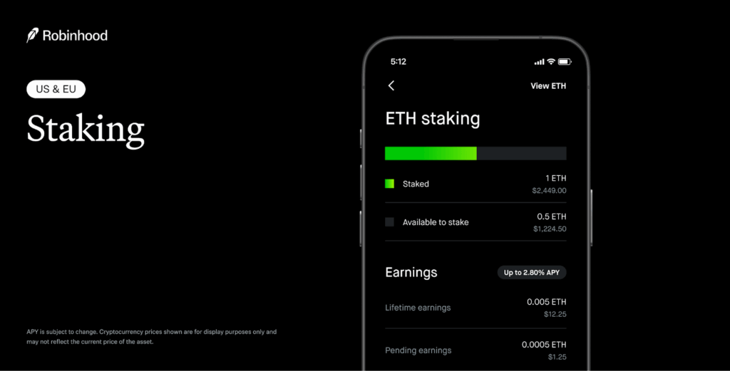 นอกจากนี้ Robinhood ยังเริ่มเปิดให้บริการ staking คริปโตในสหรัฐฯ โดยเริ่มจาก Ethereum และ Solana สำหรับลูกค้าที่มีสิทธิ์ใช้งาน โดยก่อนหน้านี้ลูกค้าใน EU และกลุ่มประเทศ EEA ก็สามารถ stake ผ่านแพลตฟอร์มได้แล้ว