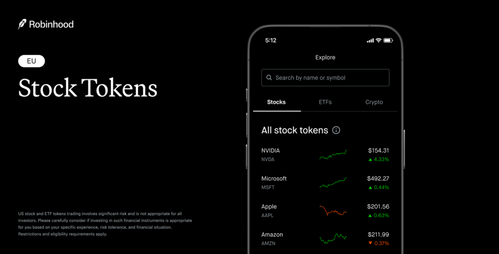 Vlad Tenev กล่าวว่า ลูกค้าในสหภาพยุโรป (EU) จะสามารถลงทุนในหุ้นสหรัฐฯ ผ่าน Robinhood Stock Tokens ได้ โดยไม่มีค่าคอมมิชชัน หรือค่าส่วนต่าง (spread) จากทางแพลตฟอร์ม (แต่ยังมีค่าใช้จ่ายอื่นตามจริง) และสามารถซื้อขายได้ตลอด 24 ชั่วโมง ซึ่งลูกค้าในยุโรปจะสามารถเข้าถึงโทเคนหุ้นและ ETF ของสหรัฐฯ กว่า 200 รายการ