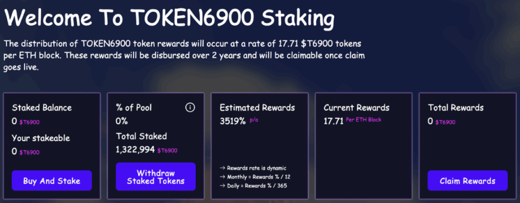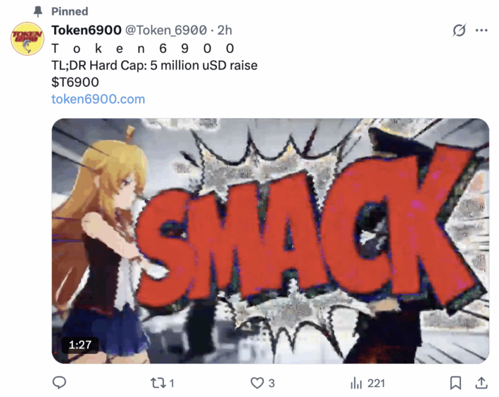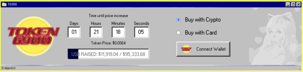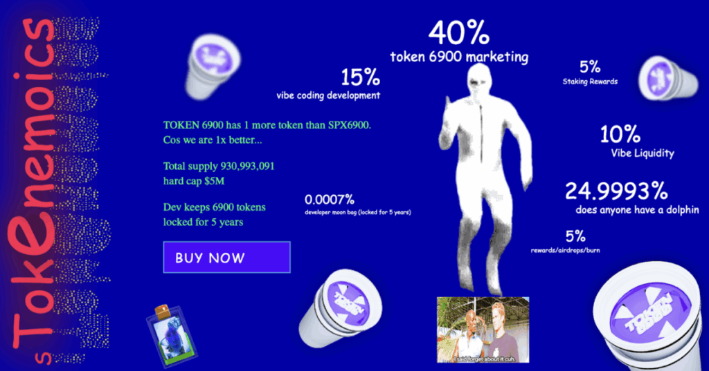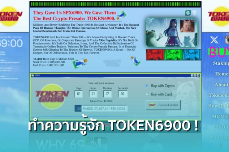TOKEN6900 คือ ความโกลาหลที่มาในรูปแบบคริปโทฯ ซึ่งได้แรงบันดาลใจจากยุคปี 2000 ผสมผสานพลังของเลข 69 แบบจัดเต็ม โปรเจกต์นี้ประกาศชัดเจนว่าไม่มีฟีเจอร์หรือการใช้งานใดๆ แต่มี Hard Cap (ยอดขายสูงสุด) อยู่ที่ 5 ล้านดอลลาร์ และกระจายโทเคนกว่า 80% หรือ 744 ล้านเหรียญให้กับผู้เข้าร่วมการระดมทุนโดยตรง
