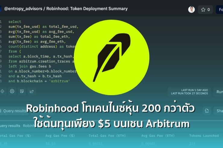 Robinhood แพลตฟอร์มเทรดหุ้นและคริปโตชื่อดังจากฝั่งสหรัฐฯ ยังคงเป็นกระแสและได้รับความสนใจอย่างต่อเนื่อง ล่าสุดพวกเขาสร้างความฮือฮาด้วยการแปลงหุ้นกว่า 213 รายการ ให้เป็นโทเคน โดยเสียค่า Gas บนบล็อกเชน Arbitrum เพียงแค่ 5.35 ดอลลาร์สหรัฐฯ หรือประมาณ 160 บาทเท่านั้น