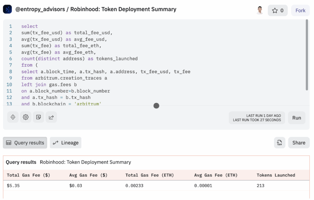 ข้อมูลจาก Arbscan เผยให้เห็นว่า กระเป๋าเงินของ Robinhood จ่ายค่าธรรมเนียมเพียง 0.00233 ETH หรือคิดเป็นประมาณ 5.35 ดอลลาร์ ตามเรทราคาปัจจุบัน เพื่อสร้างโทเคนซึ่งเป็นตัวแทนของหุ้นสหรัฐฯ ชั้นแนวหน้าอย่าง Nvidia, Microsoft และ Apple โดยเฉลี่ยแล้ว ค่าใช้จ่ายในการสร้างโทเคนอยู่ที่เพียงรายการละ 0.03 ดอลลาร์เท่านั้น