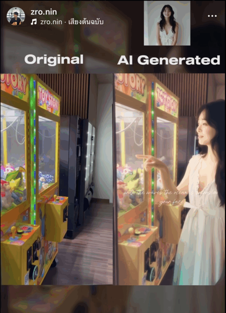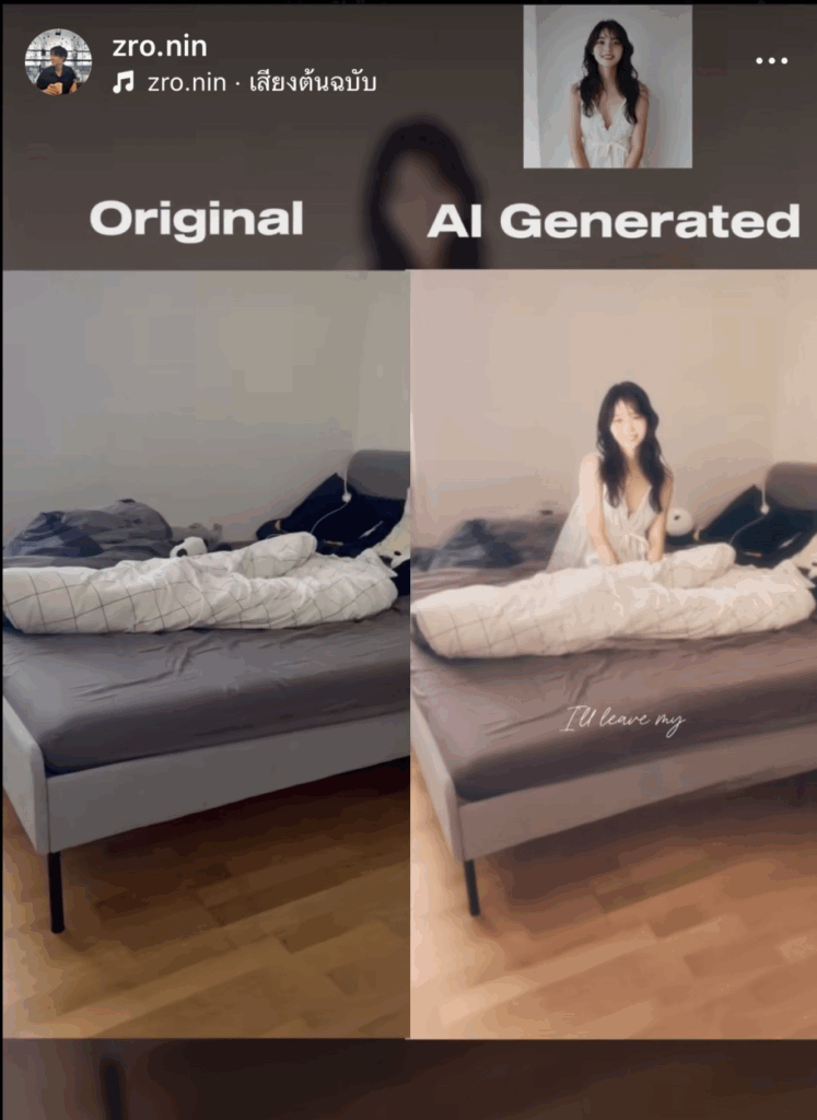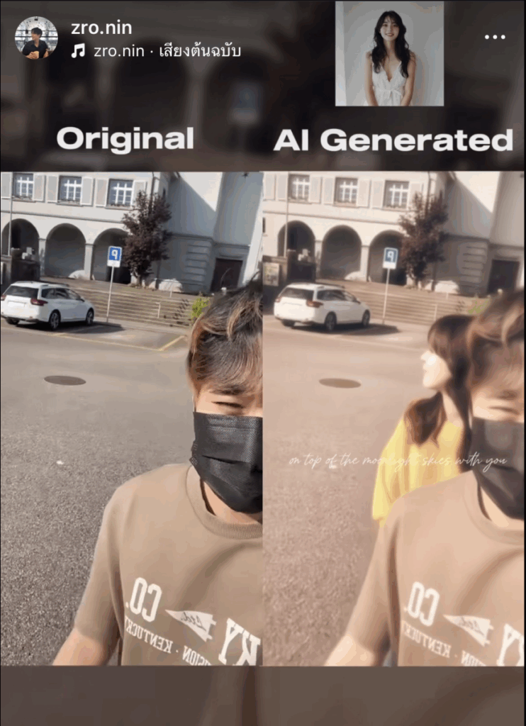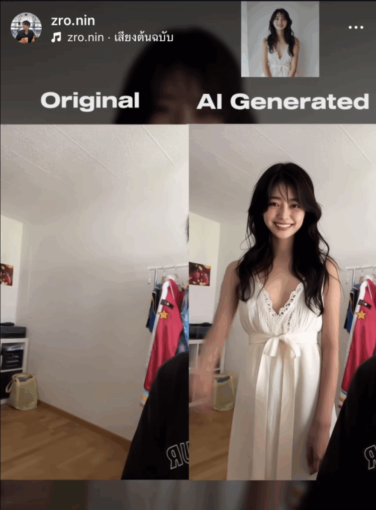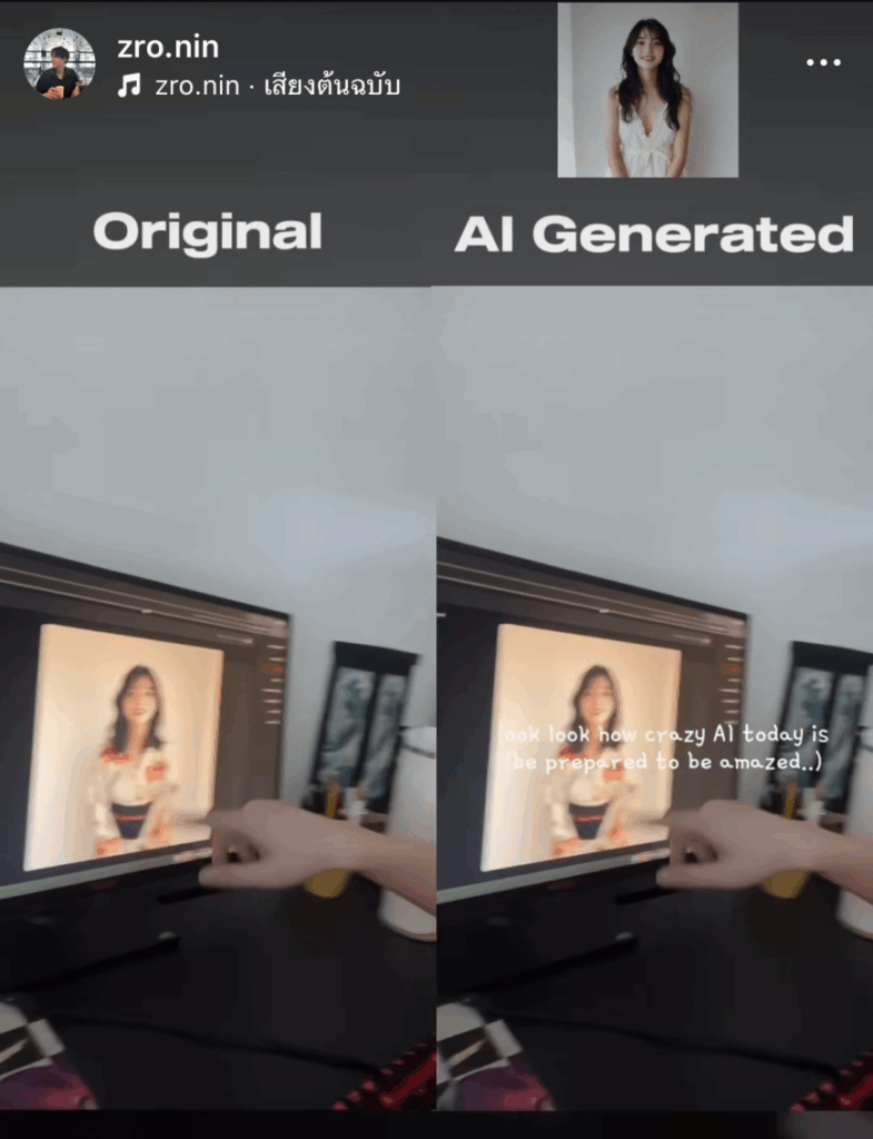 นี่ไม่ใช่เรื่องหลอกตาแต่อย่างใด เพราะเขาโชว์ให้เห็นชัด ๆ ทั้งต้นฉบับและเวอร์ชันที่สร้างด้วย AI แบบเปรียบเทียบข้างกันให้ชาวเน็ตดูได้ตะลึง พร้อมย้ำชัดในแคปชันว่า นี่ไม่ใช่คนจริงนี่คือ AI