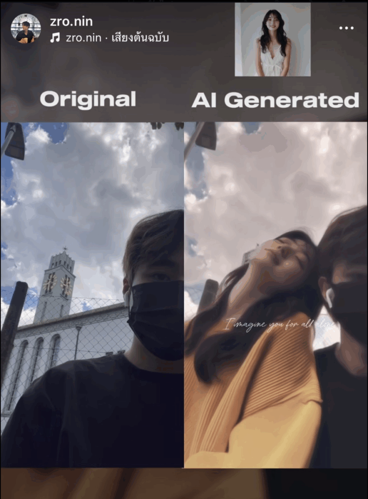 ในคลิปวิดีโอดังกล่าว มีทั้งภาพที่เหมือนกำลังใช้ชีวิตคู่กันแบบหวานหยดย้อย ทั้งมองตากลางแสงจันทร์ ทั้งเดินเล่นริมน้ำ และอีกสารพัดโมเมนต์โรแมนติกที่หลายคนดูแล้วถึงกับอุทานว่า “เหมือนจริงจนน่าขนลุก!” ด้วยเทคโนโลยี AI ที่เขาใช้สำหรับสร้างภาพ ที่ออกมาดูเนียนราวกับถ่ายจากชีวิตจริง บวกกับคำบรรยายสุดละมุนที่เขาใส่ไว้ เช่น “ฉันจินตนาการว่าคุณอยู่เพียงลำพัง บนท้องฟ้าที่เต็มไปด้วยแสงจันทร์กับคุณ” ยิ่งทำให้บรรยากาศในคลิปอบอวลไปด้วยความโรแมนติก