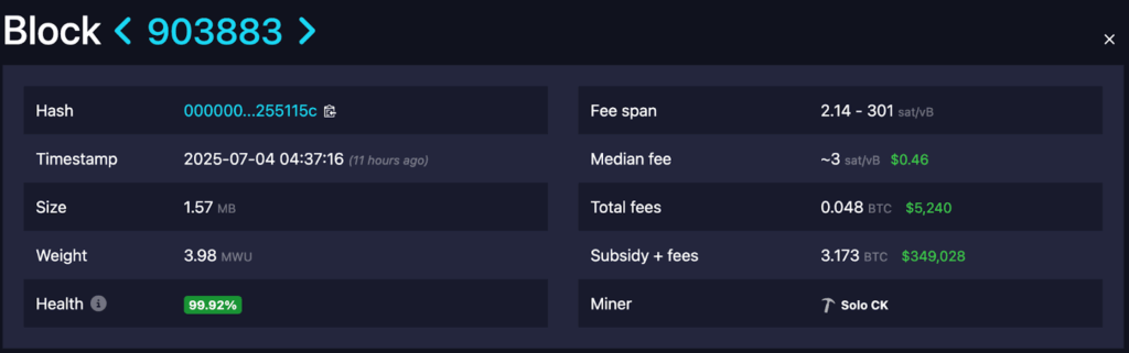 ข้อมูลเปิดเผยว่า นักขุดรายนี้ได้รับรางวัลจากการขุดบล็อก Bitcoin ณ บล็อกความสูง 903883 ผ่านระบบของ Solo CK Mining Node ในวันที่ 4 กรกฏาคม 2025 โดยมีรายละเอียดดังนี้