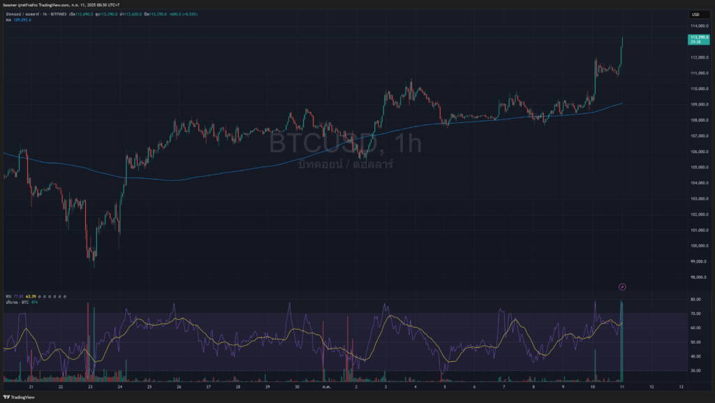 ข้อมูลจาก TradingView แสดงให้เห็นว่า Bitcoin พุ่งขึ้นกว่า +3.8% ภายในเวลา 24 ชั่วโมงที่ผ่านมา โดยมีราคาสูงสุดแตะที่ $113,359 และต่ำสุดที่ $109,105 ส่งสัญญาณเชิงบวกอย่างชัดเจนในกราฟรายวัน พร้อมด้วย Volume ที่หนาแน่นและแรงซื้อจากฝั่งตลาดสหรัฐฯ ซึ่งกลับเข้ามาอย่างมีนัยสำคัญ