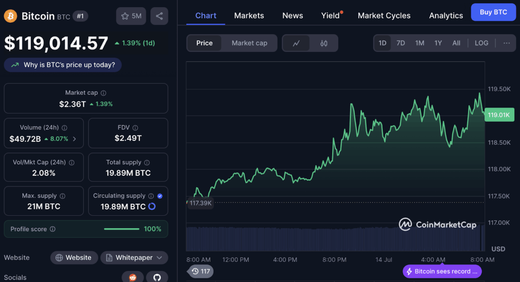 ราคาของ Bitcoin ได้พุ่งทะยานขึ้นอย่างรุนแรงในช่วงเช้าวันนี้ โดยสามารถแตะระดับสูงสุดที่ $119,488 ซึ่งถือเป็นจุดสูงสุดใหม่ตลอดกาล (All-Time High)