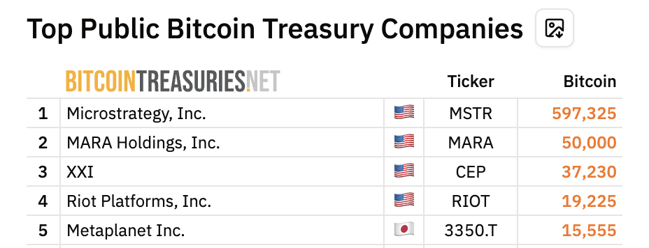 ตามข้อมูลจาก bitcointreasuries.net ระบุว่า ปัจจุบัน Metaplanet เป็นบริษัทจดทะเบียนที่ถือครอง Bitcoin มากเป็นอันดับ 5 ของโลก รองจากบริษัท Strategy (ของ Michael Saylor), MARA, Twenty One และ Riot Platforms โดยบริษัท Strategy ยังคงอันดับ 1 ด้วยจำนวนการถือครอง Bitcoin มากถึง 597,325 BTC