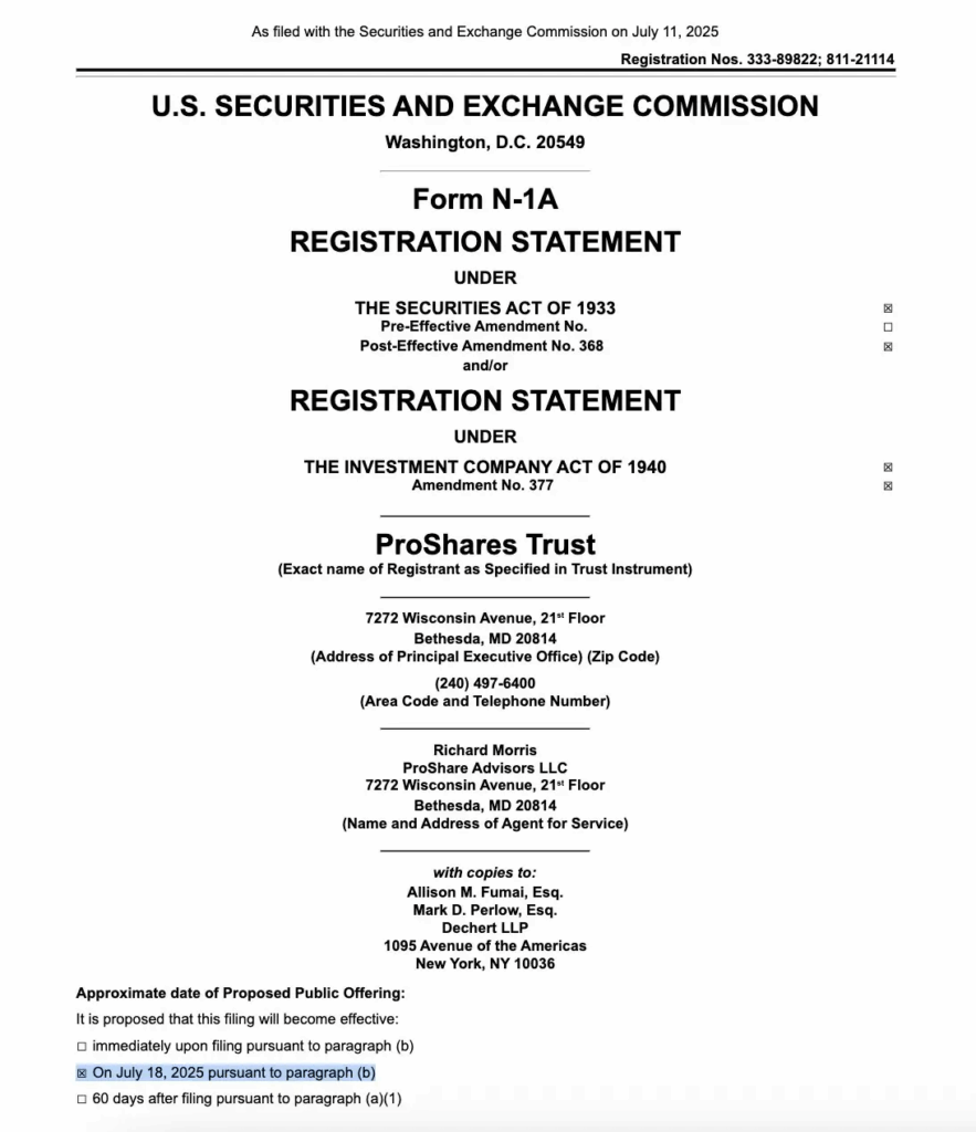 การเคลื่อนไหวครั้งสำคัญนี้ถูกเปิดเผยผ่านแบบฟอร์ม N-1A ที่ ProShares Trust ยื่นต่อสำนักงานคณะกรรมการกำกับหลักทรัพย์และตลาดหลักทรัพย์ของสหรัฐฯ (SEC) ซึ่งเป็นสัญญาณบ่งชี้ถึงความคืบหน้าที่สำคัญในตลาดสินทรัพย์ดิจิทัล