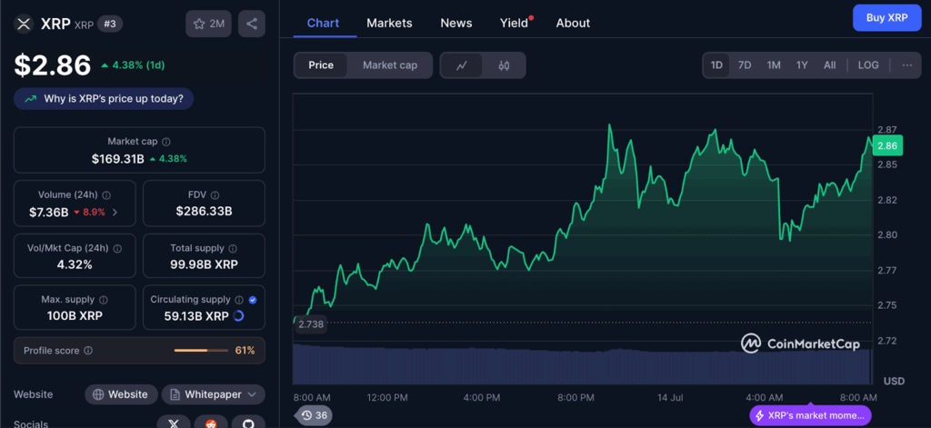 ในขณะที่รายงาน ราคา XRP กำลังซื้อขายอยู่ที่ 2.86 ดอลลาร์ เพิ่มขึ้น 4.38% ภายใน 24 ชั่วโมง อ้างอิงข้อมูลจาก coinmarketcap
