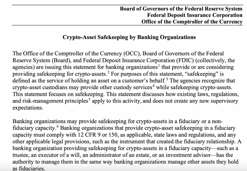 เมื่อวันจันทร์ที่ผ่านมา 3 หน่วยงานทางการเงินของรัฐบาลกลางสหรัฐฯ ได้แก่ สำนักงานประกันเงินฝากแห่งชาติ (FDIC), สำนักงานผู้ควบคุมสถาบันการเงิน (OCC), และคณะกรรมการผู้ว่าการธนาคารกลางสหรัฐฯ (Federal Reserve) ได้ร่วมกันออกเอกสารสำคัญชื่อ “การเก็บรักษาคริปโตโดยสถาบันการเงิน (Crypto-Asset Safekeeping by Banking Organizations)” เพื่อชี้แจงถึง “ความเสี่ยง” ที่ธนาคารจะต้องเผชิญ หากคิดจะให้บริการ custody หรือ “ดูแลเก็บรักษาสินทรัพย์ดิจิทัล” แก่ลูกค้า