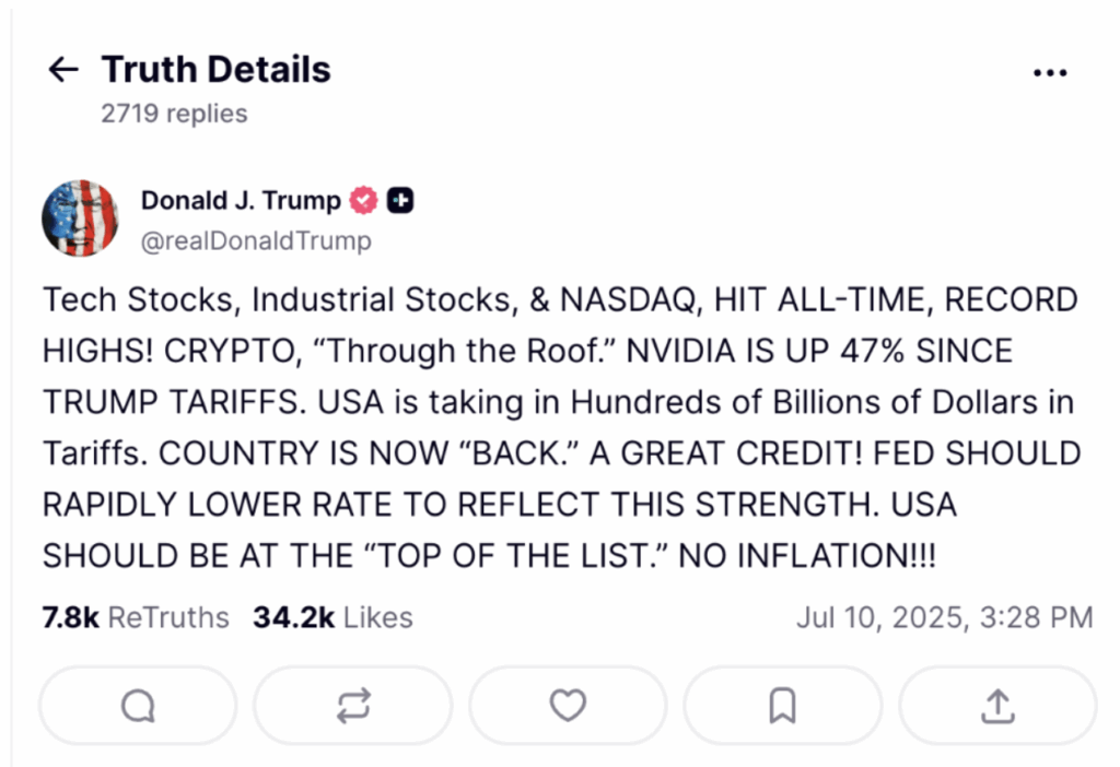 ยิ่งไปกว่านั้น ประธานาธิบดี โดนัลด์ ทรัมป์ ของสหรัฐฯ ยังได้ออกมาแสดงความเห็นผ่าน TruthSocial ว่าคริปโตกำลังจะ “พุ่งขึ้นทะลุเพดาน” แม้ว่าหลายคนจะตีความคำกล่าวถึง “เครดิตที่ยอดเยี่ยม” ในโพสต์ของทรัมป์ว่า หมายถึงเรื่องอื่น แต่ทาง TOKEN6900 กลับมองว่านี่คือการอ้างอิงถึงความชาญฉลาดของทรัมป์เอง และเชื่อมโยงกับการเทรดแบบ TACO ที่กำลังเป็นที่นิยมในวอลล์สตรีท