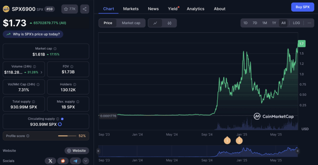 อย่างไรก็ตาม ในโลกคริปโต สิ่งต่างๆ เกิดขึ้นเร็วกว่ามาก ข้อมูลจาก CoinMarketCap แสดงให้เห็นว่าเหรียญมีม SPX6900 ให้ผลตอบแทนมหาศาลถึง 65,702,879% ตั้งแต่ 18 สิงหาคม 2023 นั่นหมายความว่าการลงทุน 100 ดอลลาร์สหรัฐฯ ในช่วงเปิดตัวจะมีมูลค่าถึง 65,702,879 ดอลลาร์สหรัฐฯ ในปัจจุบัน ซึ่งสูงกว่าผลตอบแทนของ S&P 500 ถึงสี่เท่าตัว ในระยะเวลาเพียงสองปีเท่านั้น