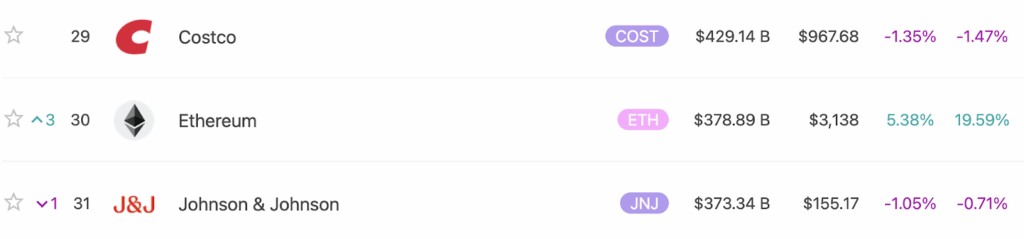 ที่น่าทึ่งคือ หลังจาก Ethereum ทำลายระดับราคา $3,000 ได้ มูลค่าของมันก็พุ่งขึ้นจนติดอันดับ 30 ของสินทรัพย์ที่มีมูลค่าตลาดสูงที่สุดในโลก โดยมีมูลค่าประมาณ 3.78 แสนล้านดอลลาร์ ซึ่งทำให้มันแซงหน้าบริษัทชั้นนำอย่าง Johnson & Johnson, Procter & Gamble และธนาคาร ICBC ได้สำเร็จ