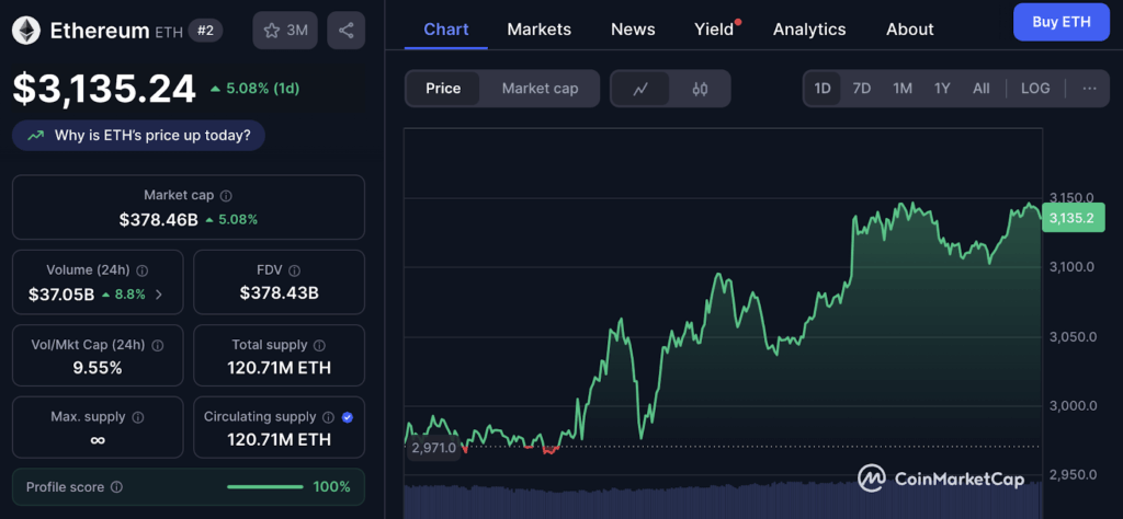 สาเหตุที่ทำให้ราคาของ Ethereum ที่พุ่งสูงขึ้นในวันนี้น่าจะเกิดจากความสนใจที่เพิ่มขึ้นจากบริษัทยักษ์ใหญ่หลายแห่งที่เริ่มนำ Ethereum มาใช้เป็นกลยุทธ์เงินสำรอง รวมทั้งปัจจัยทางเทคนิคและการที่ Bitcoin เริ่มชะลอตัว