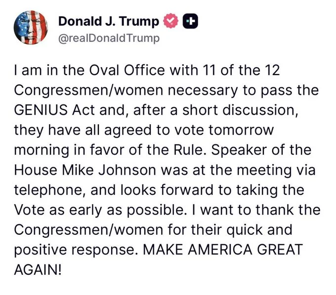 ต่อมา ทรัมป์ได้โพสต์ผ่าน Truth Social เปิดเผยว่าเขาได้หารือกับสมาชิกสภาผู้แทนราษฎรจำนวน 11 คน จากทั้งหมด 12 คนที่จำเป็นต่อการผลักดันร่างกฎหมาย GENIUS Act ให้ผ่านความเห็นชอบ โดยภายหลังการพูดคุยกันเพียงสั้น ๆ สมาชิกทั้งหมดก็แสดงความพร้อมที่จะลงคะแนนสนับสนุนร่างกฎหมายดังกล่าวในช่วงเช้าของวันพรุ่งนี้ ขณะที่ Mike Johnson ประธานสภาผู้แทนราษฎร ได้เข้าร่วมประชุมผ่านทางโทรศัพท์ และแสดงความหวังว่าจะสามารถจัดการโหวตได้โดยเร็วที่สุด