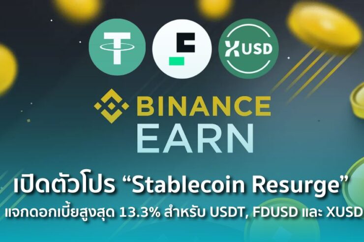 Binance Earn ได้เปิดตัวโปรโมชันใหม่ล่าสุด ที่ชื่อว่า “Stablecoin Resurge” ซึ่งมอบโอกาสให้ผู้ใช้งาน ได้รับผลตอบแทนสูงถึง 13.3% APR สำหรับการฝาก Stablecoin อย่าง USDT, FDUSD และ XUSD ในรูปแบบ Flexible Savings