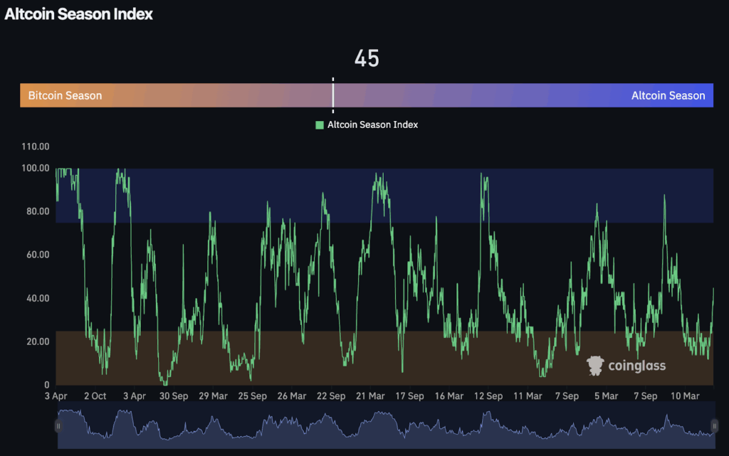 สถานการณ์ปัจจุบันของตลาดคริปโตเรียกได้ว่าเข้าสู่ Alt season ได้อย่างเต็มปาก โดยข้อมูลจาก Coinglass เผยให้เห็นว่า เกิดการเปลี่ยนแปลงขึ้นในดัชนี Altcoin season Index ที่เริ่มเอนเอียงมายังฝั่งของ Altcoin ในระดับที่ 45 คะแนน