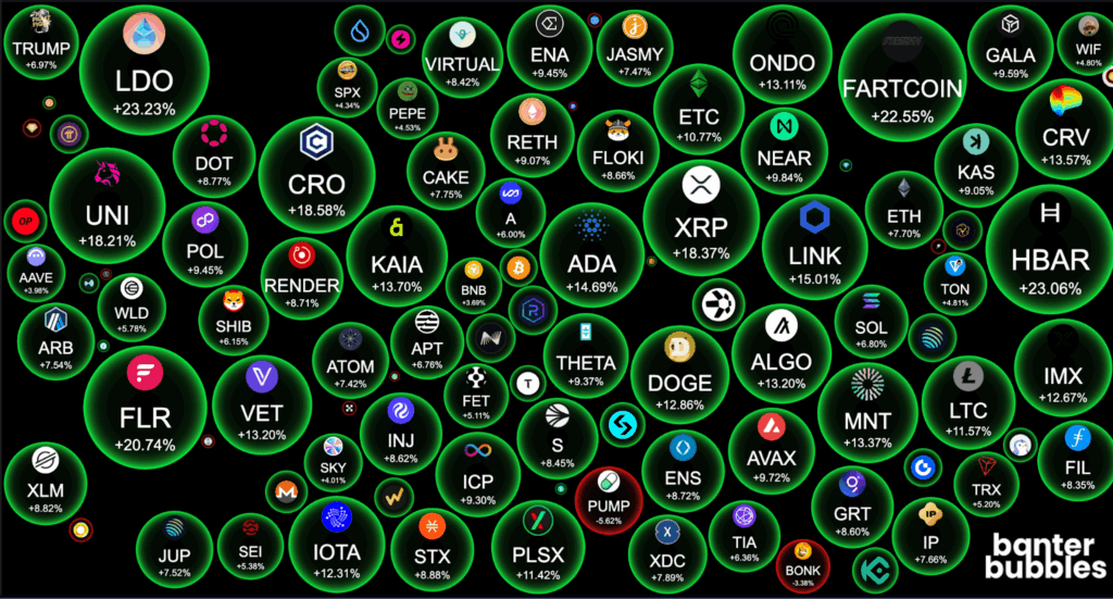 ในขณะที่รายงาน ภาพรวมของตลาดคริปโตส่วนใหญ่ในวันนี้อยู่ในโซนของขาขึ้น โดยมีผู้นำเป็น Hedera และ Flare ในขณะที่โปรเจกต์ส่วนใหญ่ก็ล้วนแล้วแต่ทะยานขึ้นสองหลักเช่นกัน และมีเพียงเหรียญใหม่อย่าง Pump.fun และ Bonk ที่ทะยานขึ้นมาก่อนหน้านี้แล้วปรับตัวลดลงในวันนี้