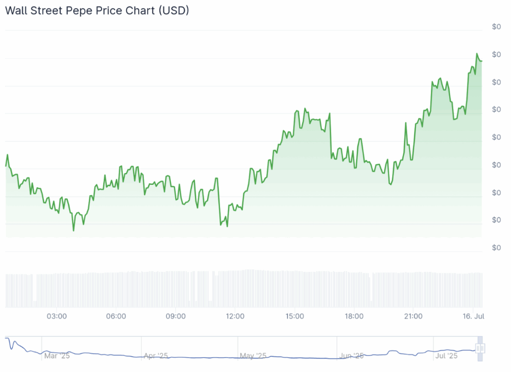 อีกตัวอย่างคือ Wall Street Pepe (WEPE) เหรียญมีมที่เคยระดมทุนในระยะเริ่มต้นได้ถึง 73 ล้านดอลลาร์ และราคาเคยพุ่งกว่า 300% ในเดือนมิถุนายน และยังคงเพิ่มขึ้น 17.7% ในช่วง 7 วันที่ผ่านมานี้ตามข้อมูลจาก CoinGecko