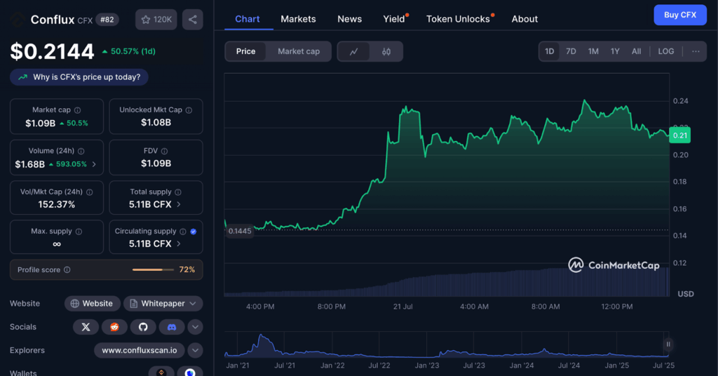 จากข้อมูลล่าสุด ราคาเหรียญ CFX ยังมีการซื้อขายอยู่ที่ 0.2144 ดอลลาร์ เพิ่มขึ้นกว่า 50% ในช่วง 24 ชั่วโมงที่ผ่านมา และผลักดันมูลค่าตลาดรวมพุ่งแตะระดับประมาณ 1.1 พันล้านดอลลาร์ อ้างอิงจาก CoinMarketCap