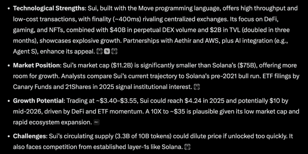 สำหรับ Sui (SUI) นั้น Grok AI ประเมินว่ามีโอกาสพุ่งสูงถึง 10 เท่า สืบเนื่องจากความสามารถในการปรับขนาดและประสิทธิภาพการออกแบบที่โดดเด่น ทำให้มีการทำธุรกรรมที่รวดเร็วที่สุดและค่าธรรมเนียมเครือข่ายที่ต่ำที่สุดในวงการบล็อกเชน