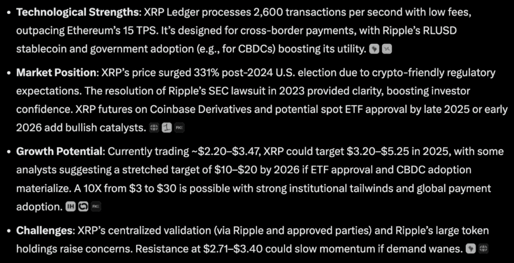 ในส่วนของ Ripple (XRP) Grok AI เชื่อว่า ความชัดเจนด้านกฎระเบียบและการนำไปใช้โดยสถาบันเป็นปัจจัยสำคัญที่จะขับเคลื่อนการเติบโตถึง 10 เท่า Grok ได้เน้นย้ำถึงศักยภาพของเครือข่าย Ripple ที่สามารถประมวลผลได้สูงสุด 2,600 ธุรกรรมต่อวินาที และการเปิดตัว Ripple USD (RLUSD) ซึ่งเป็น Stablecoin ดั้งเดิมตัวแรกของระบบนิเวศนี้ ซึ่งจะช่วยเร่งการนำเครือข่ายไปใช้งานสำหรับการชำระเงินข้ามพรมแดน