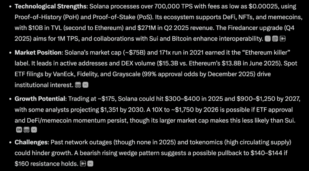 ปิดท้ายกันที่ Solana (SOL) เจ้า Grok AI ชี้ว่า ประสิทธิภาพสูงสุดของบล็อกเชนและระบบนิเวศ DeFi ที่กำลังเติบโต จะเป็นตัวเร่งหลักที่อาจส่งผลให้ SOL ทำกำไรได้ 10 เท่าภายในปี 2025