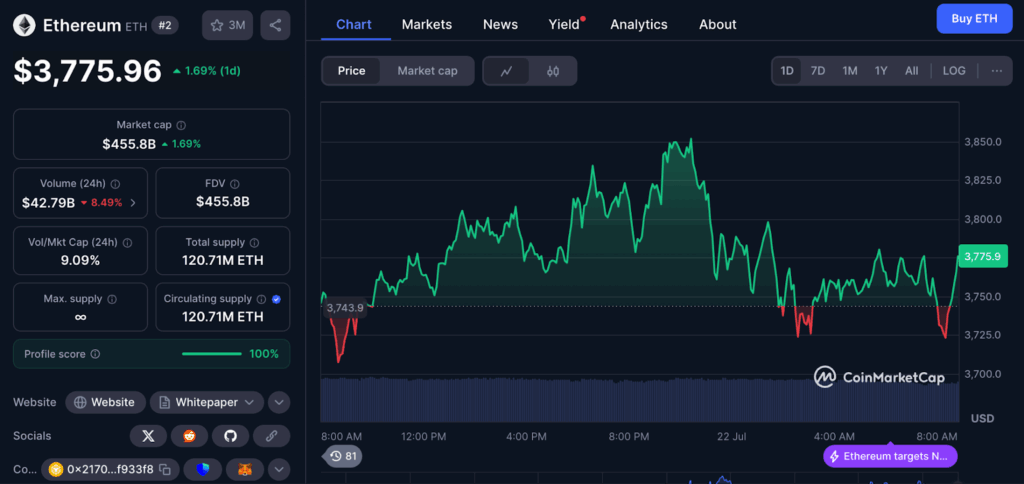 ในขณะที่รายงาน ราคาของ Ethereum กำลังซื้อขายอยู่ที่ประมาณ 3,775.96 ดอลลาร์ เพิ่มขึ้น 1.69% ภายใน 24 ชั่วโมง อ้างอิงข้อมูลจาก coinmarketcap