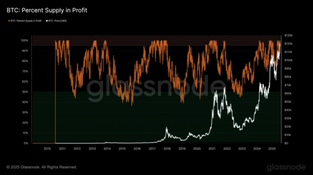 การปรับตัวขึ้นครั้งนี้ ไม่ได้มาจากนักลงทุนรายย่อยเพียงลำพัง แต่ยังเกิดขึ้นพร้อมกับการเพิ่มขึ้นอย่างรวดเร็วของทั้งการเปิดสถานะสัญญาซื้อขายล่วงหน้า (Open interest) และปริมาณการซื้อขายในช่วง 24 ชั่วโมง ซึ่งบ่งชี้ว่ามีแรงซื้อเข้ามาอย่างมหาศาลจากทั้งนักลงทุนสถาบันและรายใหญ่ โดยสัดส่วนของอุปทานที่ทำกำไรได้อยู่ในระดับสูงสุดนับตั้งแต่ปี 2018