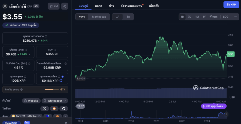 ในขณะที่รายงาน XRP มีการซื้อขายกันอยู่ที่ 3.55 ดอลลาร์ ปรับตัวเพิ่มขึ้น 2.76% ในช่วง 24 ชั่วโมงที่ผ่านมา ตามข้อมูลจาก CoinMarketCap