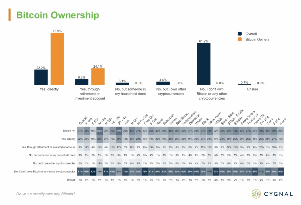บริษัทวิจัย Cygnal ได้เผยผลสำรวจล่าสุดเกี่ยวกับผู้ถือครอง Bitcoin และบทบาทของพวกเขาต่อการเมืองสหรัฐฯ โดยสำรวจกลุ่มตัวอย่างผู้มีสิทธิเลือกตั้งราว 800 คน ก่อนงานประชุม Bitcoin Policy Summit