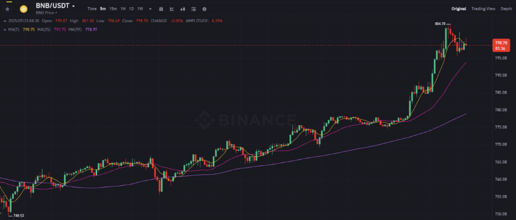 ข้อมูลจาก CoinGecko เผยให้เห็นว่า ราคาของ BNB ได้พุ่งขึ้นแตะระดับสูงสุดที่ 804 ดอลลาร์ บนแพลตฟอร์ม Binance ซึ่งนับว่าเป็นจุดสูงสุดใหม่ในประวัติศาสตร์ของเหรียญนี้ นับตั้งแต่เริ่มเปิดให้มีการซื้อขาย